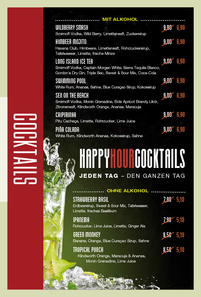 Und vorweg oder danach passt einer unserer köstlichen Happy Hour-Cocktails – jeden Tag, den ganzen Tag!