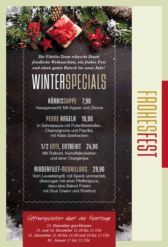 Das Jahr geht zur Neige und wir dürfen uns wieder auf die typischen Gerichte der Winterzeit freuen. Ob hausgemachte Kürbissuppe, krosse Ente oder Rinderfilet- Medaillons vom Lavasteingrill, für jeden Geschmack ist etwas dabei.